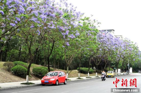 5月12日,成都市武侯區(qū)晉陽街道晉吉社區(qū)武晉路上600株藍(lán)花楹全部綻放,造就了一條長(zhǎng)約1700米的藍(lán)花楹長(zhǎng)廊,浪漫紫色花海美出了天際。安源 攝