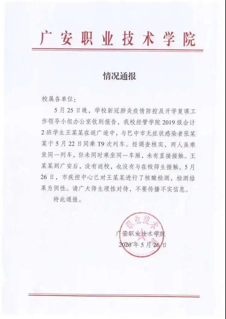 公告稱, 5月25日晚,廣安職業(yè)技術學院新冠肺炎疫情防控及開學復課工作領導小組辦公室收到報告,該校經管學院2019級會計2班學生王某某在返廣(安)途中,與巴中市無癥狀感染者張某某于5月22日同乘T9次列車。經調查核實,兩人雖乘坐同一列車,但未同時乘坐同一車廂,未有直接接觸。王某某到廣安后,沒有返校,也沒有與在校師生接觸。5月26日,廣安市疾控中心對王某某進行核酸檢測,檢測結果為陰性。