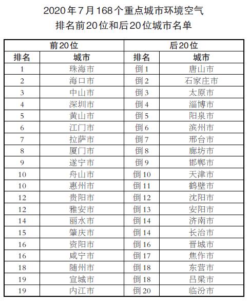 7月,168個重點城市中唐山、石家莊和太原市等城市空氣質(zhì)量相對較差;珠海、??诤椭猩绞械瘸鞘锌諝赓|(zhì)量相對較好。
