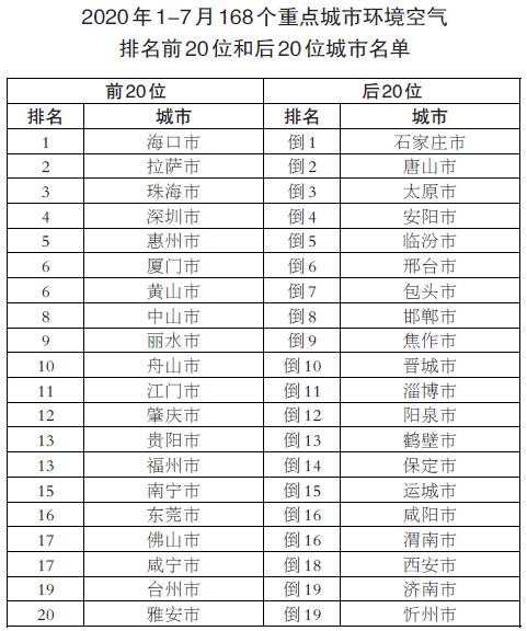 1-7月,168個重點城市中石家莊、唐山和太原市等城市空氣質(zhì)量相對較差;???、拉薩、珠海市等城市空氣質(zhì)量相對較好。