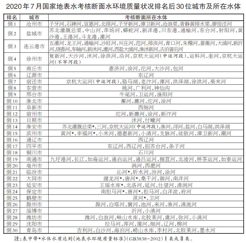 地級及以上城市國家地表水考核斷面排名