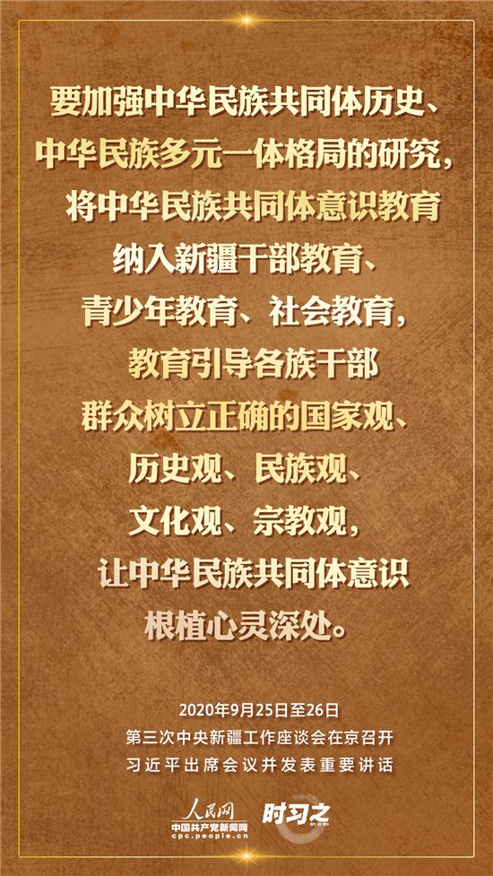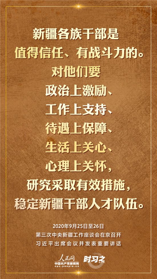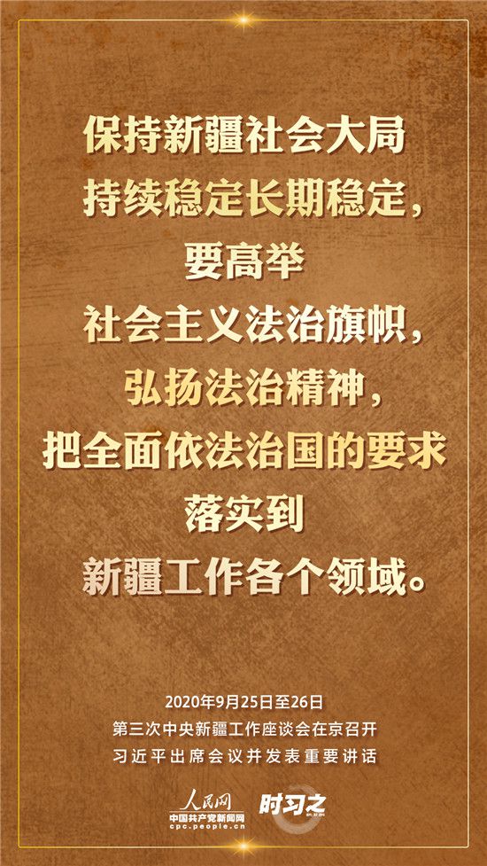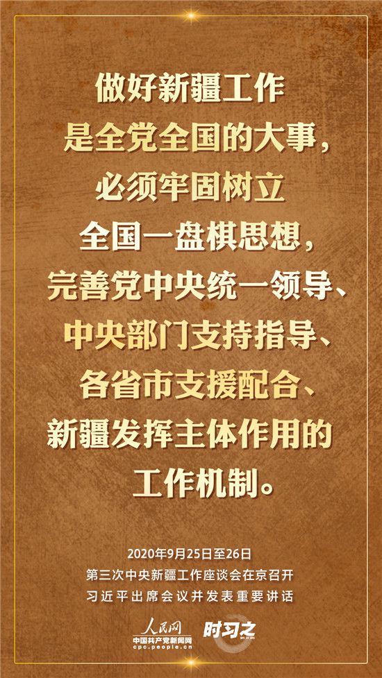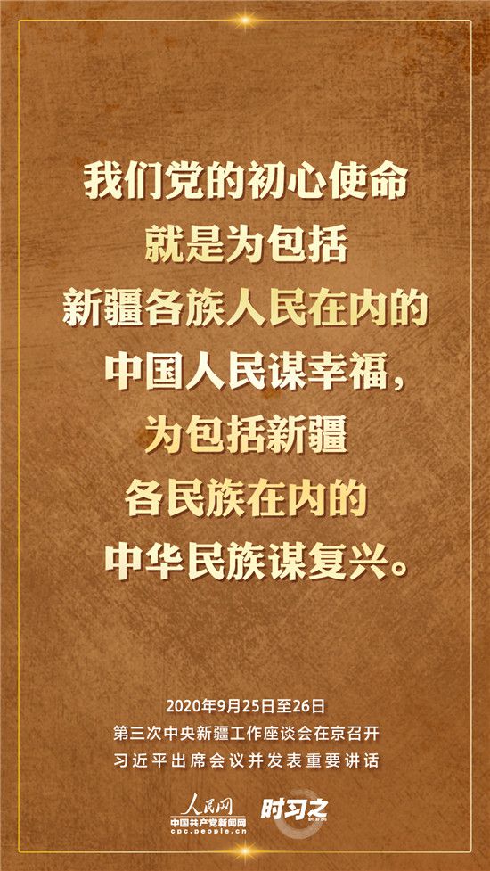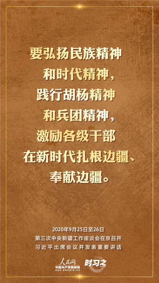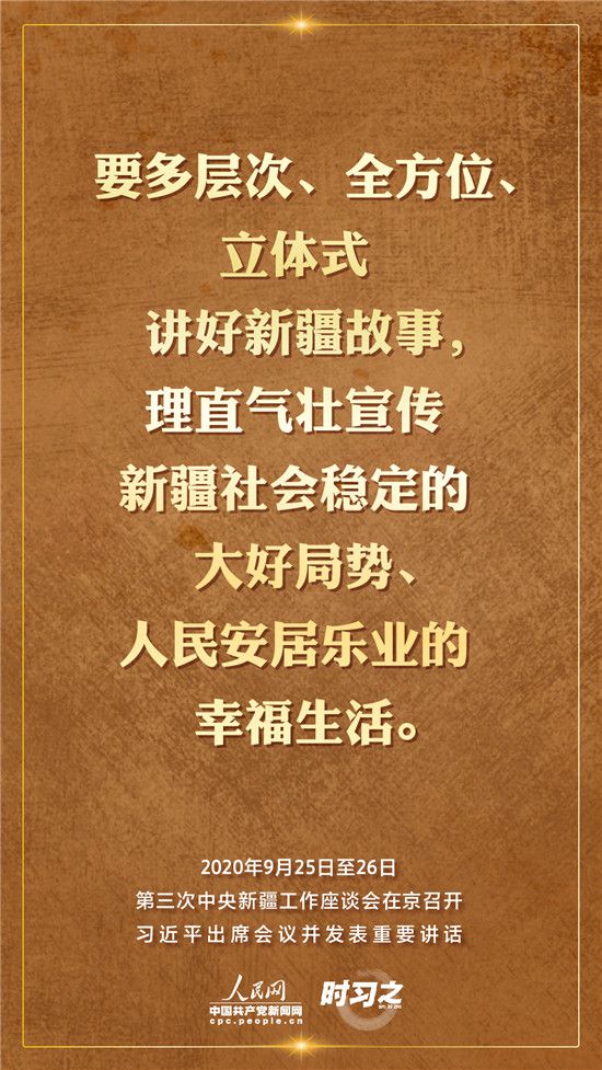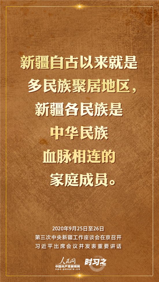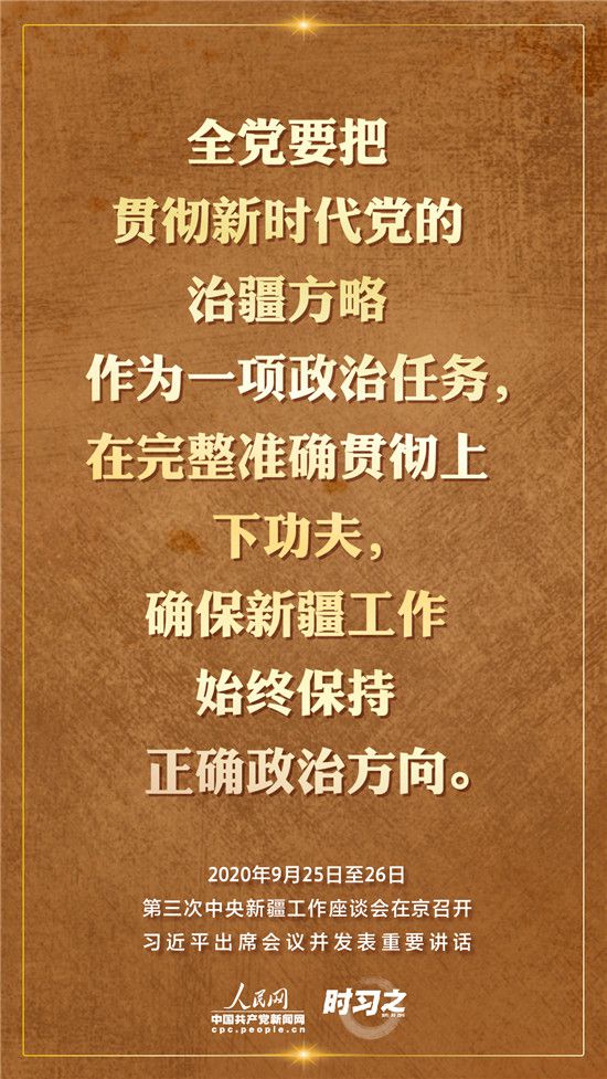 9月25日至26日,第三次中央新疆工作座談會在北京召開。習近平總書記出席會議并發(fā)表重要講話。習近平全面總結(jié)了第二次中央新疆工作座談會以來新疆工作取得的重大成效,深入分析了當前新疆工作面臨的形勢,闡釋了新時代黨的治疆方略,明確了當前和今后一個時期新疆工作的指導思想、目標任務(wù)、方針政策、戰(zhàn)略舉措,全面部署了推動新疆社會穩(wěn)定和長治久安的重點工作。人民網(wǎng)·中國共產(chǎn)黨新聞網(wǎng)“時習之”欄目帶您聆聽總書記那些直抵人心的講話金句。