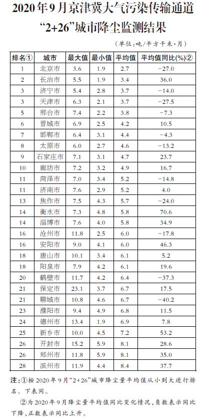 生態(tài)環(huán)境部今日向媒體公布了2020年9月京津冀大氣污染傳輸通道“2+26”城市(以下簡(jiǎn)稱(chēng)“2+26”城市)和汾渭平原11城市降塵監(jiān)測(cè)結(jié)果。