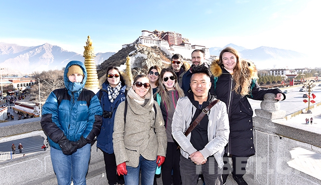 新年第一天,記者在西藏自治區(qū)拉薩市藥王山觀景臺遇見了來自美國的游客Lauren和她的團友們。這是一個由8名游客組成的外賓團,他們分別來自美國、哥倫比亞等7個國家。