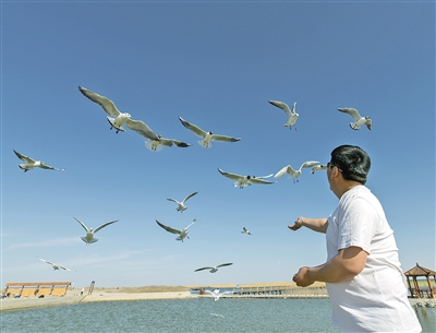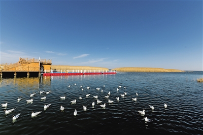 “湖濱密生蘆葦,入秋蘆花飛舞,宛若柳絮?!Z翔天際,鴨浮綠波,碧水青天,馬嘶雁鳴……”居延海曾經(jīng)失去過這樣的神韻風(fēng)姿。 近年來,隨著保護(hù)力度的加大與生態(tài)環(huán)境逐漸恢復(fù),湖中生機(jī)再現(xiàn),樹木起死回生,水鳥凌空飛翔,這顆大漠深處的藍(lán)色明珠再一次熠熠生輝?。ㄓ浾?懷特烏勒斯 攝影報道)