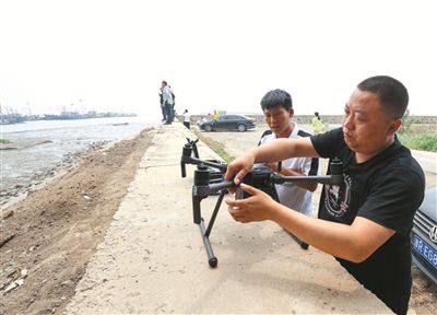 工作人員正在使用無(wú)人機(jī)對(duì)排污口進(jìn)行排查記者 何沛霖 攝