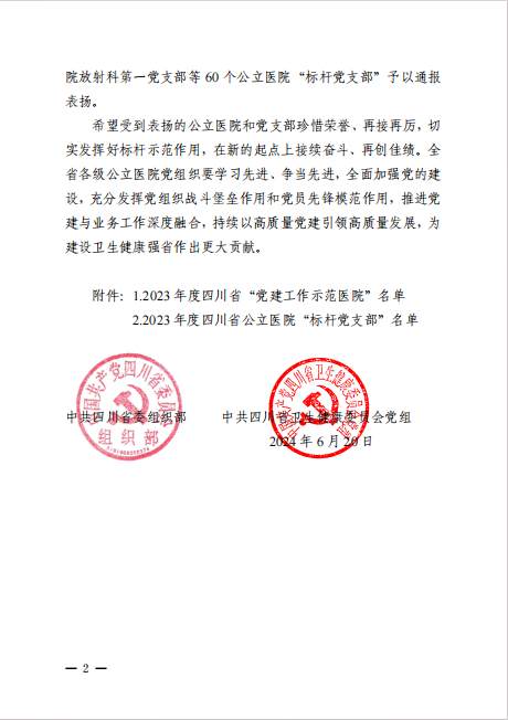 近日,中共四川省委組織部、中共四川省衛(wèi)生健康委員會(huì)黨組發(fā)文通報(bào)表揚(yáng)了2023年度四川省“黨建工作示范醫(yī)院”和公立醫(yī)院“標(biāo)桿黨支部”(川衛(wèi)組函〔2024〕15號(hào)),安岳縣人民醫(yī)院榮獲2023年度四川省“黨建工作示范醫(yī)院”!