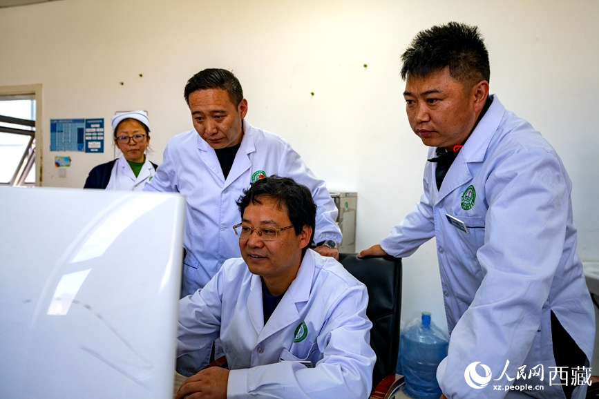 吳維(右一)和強巴旦增(右二)在查看患者的影像資料。人民日報記者 徐馭堯攝