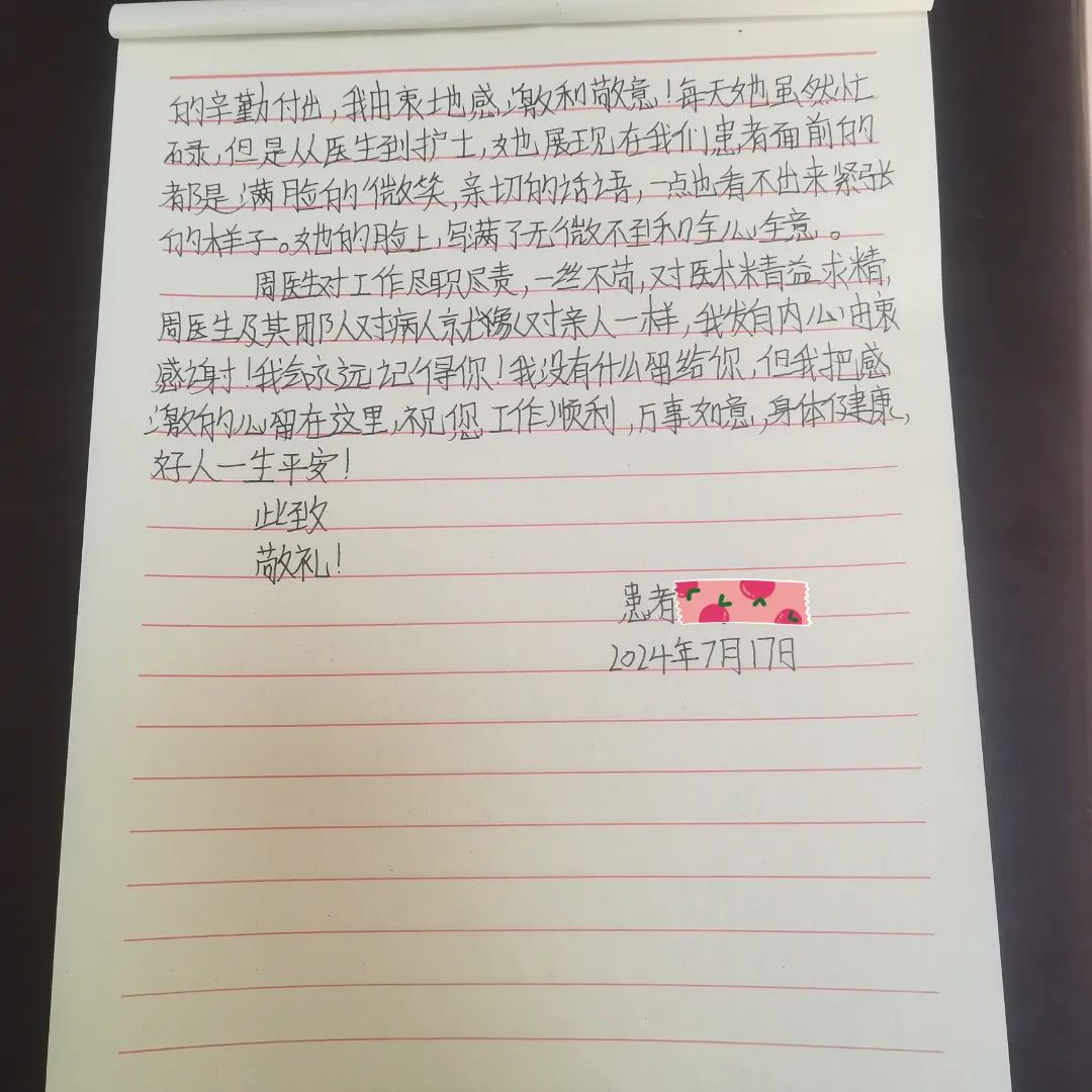 7月1日,一名在德格縣人民醫(yī)院就診的結(jié)核患者向成都市公共衛(wèi)生臨床醫(yī)療中心援藏醫(yī)師周瑜送來了一封感謝信,在信中,患者對周瑜醫(yī)生及其團(tuán)隊(duì)在住院期間給予她的積極診治和熱情關(guān)懷表示感謝,并對科室團(tuán)隊(duì)的診療技術(shù)和治療的預(yù)后效果都作出了非常高的評(píng)價(jià)。