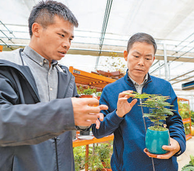 胡發(fā)煒(右)在紅河谷農(nóng)業(yè)園區(qū)查看盆栽生長情況。記者 徐馭堯攝