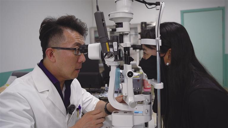 天津市第十批援藏干部、昌都市藏醫(yī)院眼科副主任醫(yī)師步紹翀開展眼科檢查。記者 貢曲羅杰 鄭常容