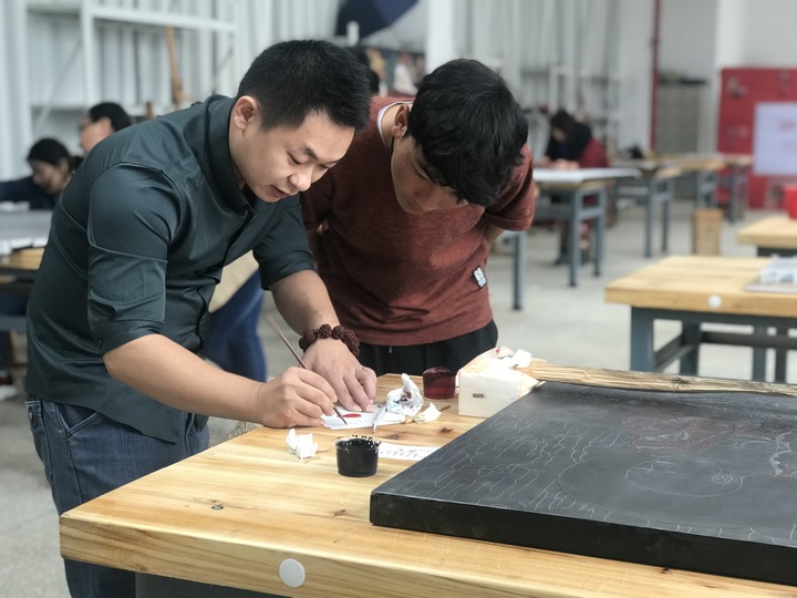 2018年,仁青郎加(右)跟老師學習漆畫技法。(受訪者供圖)