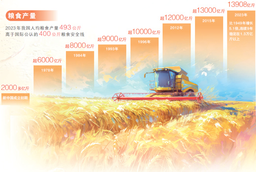 豐收成色十足。“藏糧于地、藏糧于技”戰(zhàn)略深入實(shí)施,我國糧食綜合生產(chǎn)能力穩(wěn)步提升,連續(xù)9年穩(wěn)定在1.3萬億斤以上。截至2023年,全國綠色、有機(jī)、名特優(yōu)新和地理標(biāo)志農(nóng)產(chǎn)品認(rèn)證登記總數(shù)達(dá)到7.5萬個(gè)。蔬菜水果品種琳瑯滿目,居民的“菜籃子”“果盤子”更加豐富。
