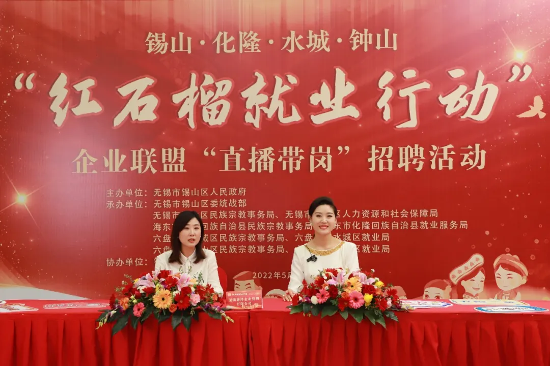 江蘇省無錫市錫山區(qū)與貴州省六盤水市水城區(qū)、鐘山區(qū),青海省海東市化隆回族自治縣通過網(wǎng)絡(luò)平臺舉行“紅石榴就業(yè)行動”合作簽約暨企業(yè)聯(lián)盟“直播帶崗”招聘活動。江蘇省民族宗教事務(wù)委員會供圖