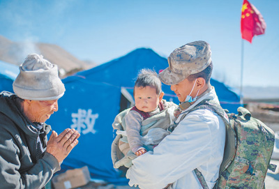 1月9日,在定日縣長所鄉(xiāng)古榮村安置點,受災(zāi)群眾感謝西藏軍區(qū)陸軍某部隊衛(wèi)生員的醫(yī)療救治。人民網(wǎng)記者 翁奇羽攝