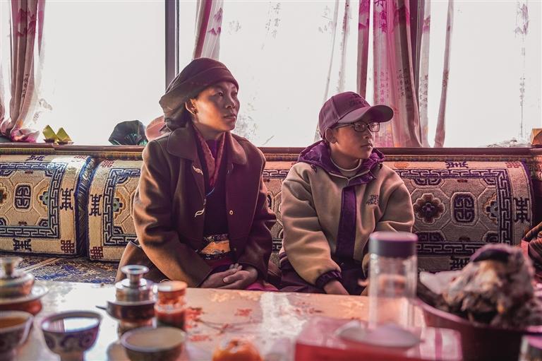 當(dāng)日,天空晴朗,在廣袤無垠、無樹木遮擋的曠野上,稍起一陣疾風(fēng),便會揚起一層薄薄的黃沙。從村委會出發(fā),沿著冰湖畔的水泥小路前行,很快就來到了村民倫珠曲珍的家。一進屋,厚實的木門便將凜冽的寒風(fēng)擋在了門外?!翱煺堖M,這幾天風(fēng)沙有點大,普莫雍措都沒以前藍(lán)了。”倫珠曲珍一邊關(guān)門一邊熱情地笑著說道。