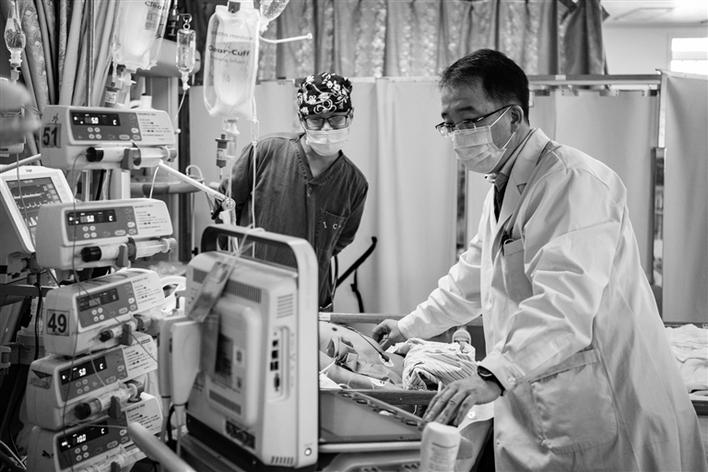 北京援藏醫(yī)生王小亭(右)在西藏自治區(qū)人民醫(yī)院病房為病人做重癥超聲評(píng)估。新華社