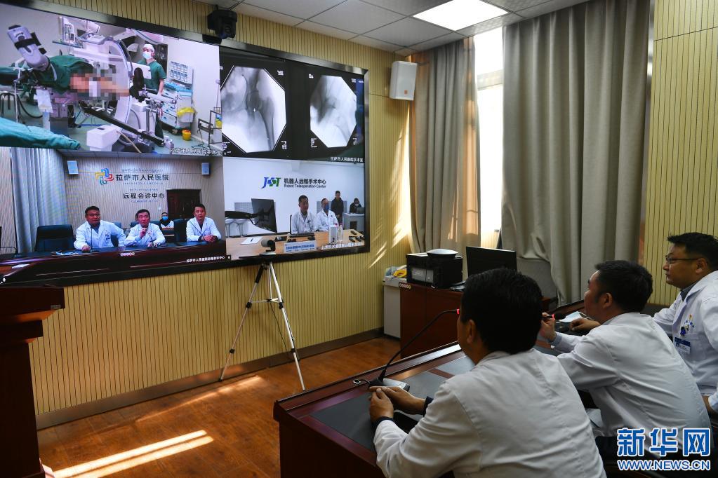 4月19日,拉薩市人民醫(yī)院骨科醫(yī)生在北京積水潭醫(yī)院專家遠(yuǎn)程指導(dǎo)下使用骨科機(jī)器人開展骨科手術(shù)。新華社記者 孫瑞博 攝