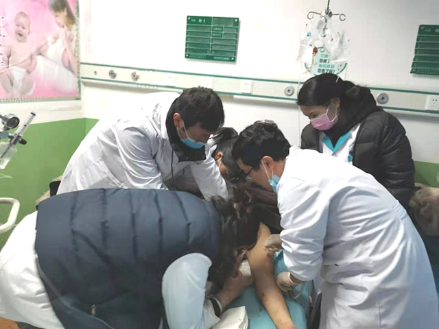 臍帶脫垂是威脅胎兒生命的嚴(yán)重并發(fā)癥,可謂產(chǎn)科急癥中的急癥。“孕婦頭低臀高,馬上準(zhǔn)備剖宮產(chǎn)。”孫豐濤顧不得高原反應(yīng)的不適,一邊小跑,一邊做著急救安排。醫(yī)療隊(duì)隊(duì)長徐鴻宇、隊(duì)員李捷、徐兵分頭行動,展開術(shù)前準(zhǔn)備。
