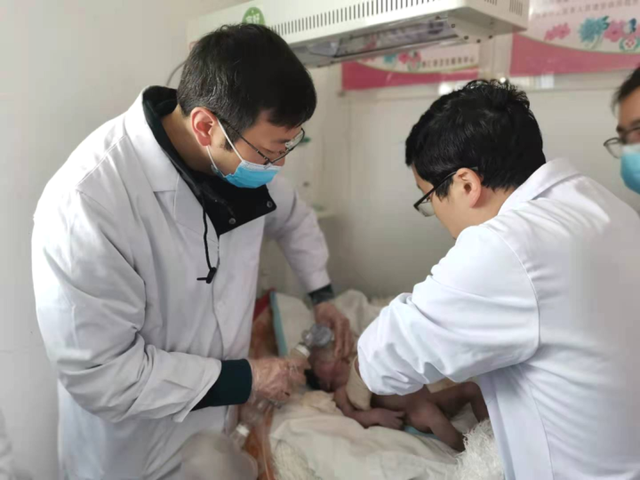 徐鴻宇(左一)和孫豐濤(右一)為新生兒心肺復(fù)蘇、插管