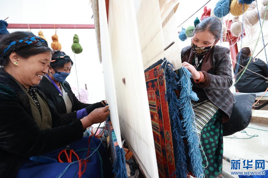 山南市瓊結(jié)縣農(nóng)牧民在襄陽(yáng)援藏工作隊(duì)引進(jìn)的西藏薩喜欽布公司編織藏毯(2021年6月18日攝)。(受訪者供圖)