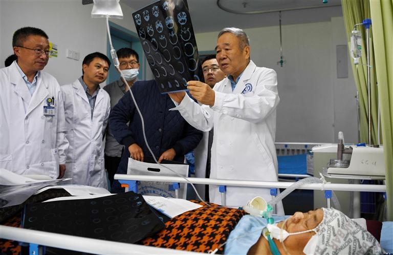 配圖:中國科學(xué)院院士、首都醫(yī)科大學(xué)附屬北京天壇醫(yī)院神經(jīng)外科學(xué)中心主任醫(yī)師趙繼宗(后右一)在自治區(qū)第二人民醫(yī)院為患者會(huì)診。 新華社記者 張汝鋒 攝