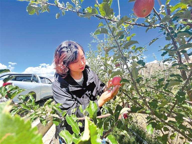 圖為毛莎莎在扎囊縣朗賽嶺矮化蘋果種植基地里查看蘋果長勢。 見習(xí)記者 武沛濤 攝