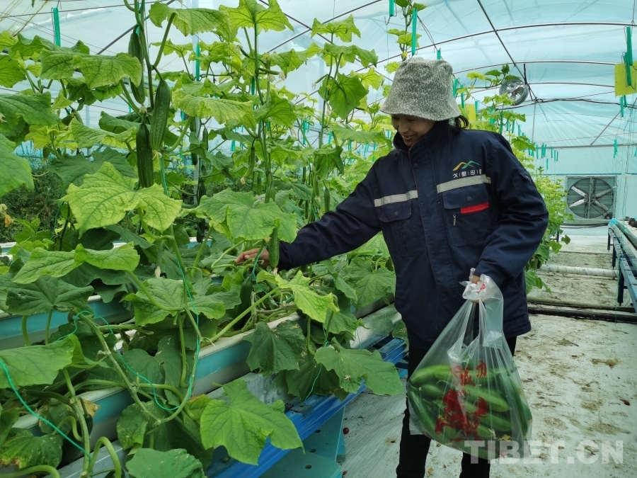 多吉曲西正在植物工廠里采摘成熟的黃瓜 攝影:鄒慧