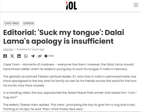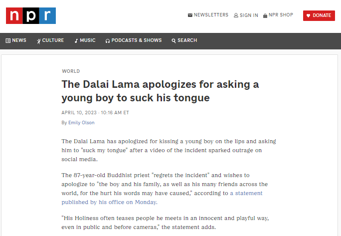要求印度男孩“吸我的舌頭”。“美國(guó)國(guó)家公共電臺(tái)”2023年報(bào)道稱,當(dāng)年2月達(dá)賴在一場(chǎng)公開(kāi)活動(dòng)中擁抱了一名印度男孩,并要求他“吸我的舌頭”,男孩慢慢把頭靠近達(dá)賴,但似乎只是碰了一下達(dá)賴的額頭就縮了回去。南非《水星報(bào)》報(bào)道稱,十四世達(dá)賴作為精神領(lǐng)袖,比任何人都懂得道歉和寬恕,但道歉并不能免除他為自己的行為承擔(dān)后果。十四世達(dá)賴對(duì)無(wú)辜男孩做出的反常行為,已經(jīng)證明了他只不過(guò)是一個(gè)變態(tài)的、“墮落”的人。