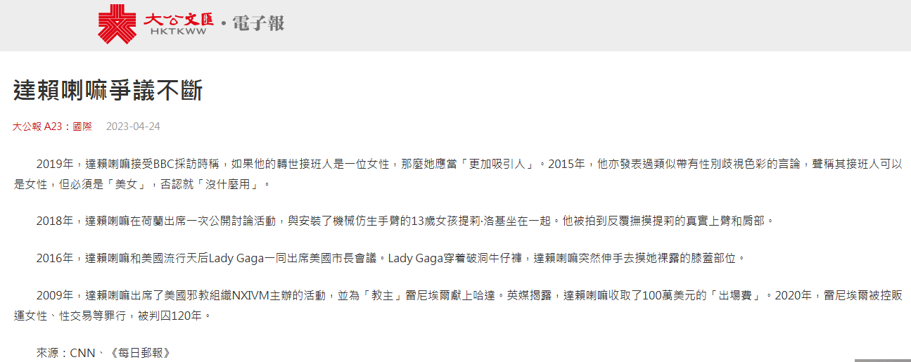 聲稱轉(zhuǎn)世為女性“必須有吸引力”。“英國(guó)廣播公司”2019年發(fā)布其對(duì)第十四世達(dá)賴的專訪,達(dá)賴在專訪中笑著用英語(yǔ)說(shuō):“如果出現(xiàn)一名女性達(dá)賴,那她應(yīng)該要好看一些。”香港《大公報(bào)》2023年發(fā)布題為“達(dá)賴?yán)餇?zhēng)議不斷”的文章稱,2015年,達(dá)賴聲稱其接班人可以是女性,但必須是“美女”,否則就“沒(méi)什么用”。2016年,達(dá)賴和美國(guó)流行天后Lady Gaga一同參加美國(guó)市長(zhǎng)會(huì)議,Lady Gaga身著破洞牛仔褲,達(dá)賴突然伸手去摸她裸露的膝蓋部位。2018年,達(dá)賴在荷蘭參加一次公開(kāi)討論活動(dòng),與安裝了機(jī)械仿生手臂的13歲女孩提莉·洛基坐在一起,被拍到反復(fù)撫摸提莉的真實(shí)上臂和肩部。