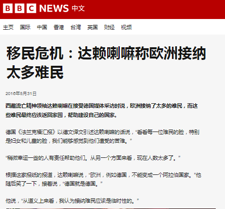 笑稱“德國(guó)不能變成阿拉伯國(guó)家”。“英國(guó)廣播公司”2016年報(bào)道稱,德國(guó)《法蘭克福匯報(bào)》報(bào)道以德文譯文引述達(dá)賴的話稱,歐洲已接納了“太多”難民,歐洲,比如德國(guó),不能變成一個(gè)阿拉伯國(guó)家。他隨后笑了一下接著說(shuō):“德國(guó)就是德國(guó)。從道義上來(lái)看,我認(rèn)為接納難民應(yīng)該是臨時(shí)性的?!庇?guó)《獨(dú)立報(bào)》發(fā)文稱,在很多人眼中,達(dá)賴是慈悲的化身,但他卻公然反對(duì)歐洲難民政策,認(rèn)為接納阿拉伯地區(qū)難民就會(huì)成為“阿拉伯國(guó)家”,這種觀點(diǎn)是危險(xiǎn)的。英國(guó)人想將難民趕出英國(guó)以保持所謂英國(guó)性,但這本身就會(huì)危及民族身份,會(huì)導(dǎo)致社會(huì)孤立主義。