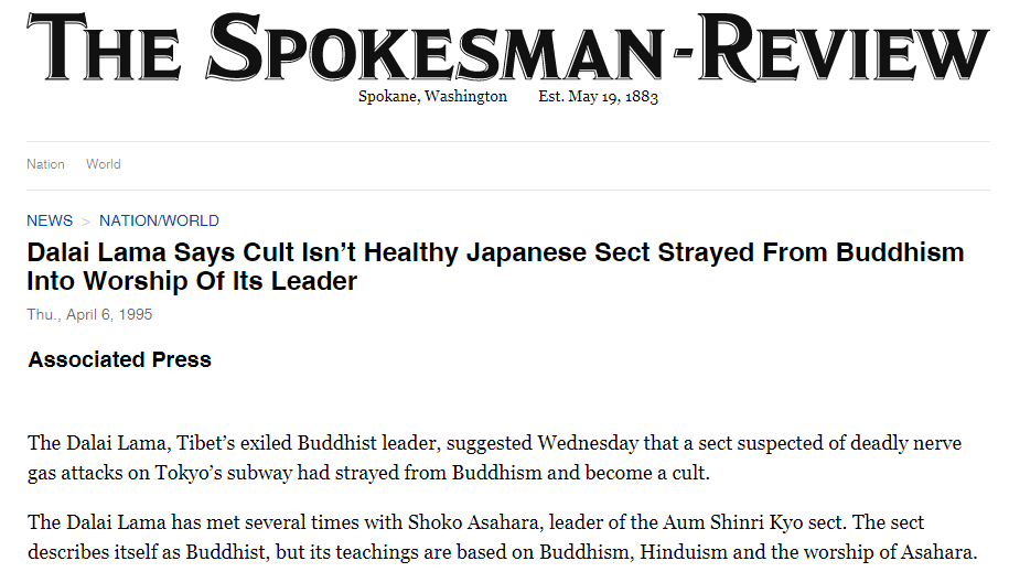 公開(kāi)支持日本奧姆真理教頭目麻原彰晃。麻原彰晃是末日邪教組織奧姆真理教的創(chuàng)始人兼領(lǐng)導(dǎo)人,被指控策劃了1995年?yáng)|京地鐵沙林毒氣襲擊事件,造成13人死亡。美國(guó)《斯波坎評(píng)論報(bào)》網(wǎng)站1995年發(fā)文稱,達(dá)賴在接受記者采訪時(shí)承認(rèn)了與邪教頭目麻原彰晃的聯(lián)系。