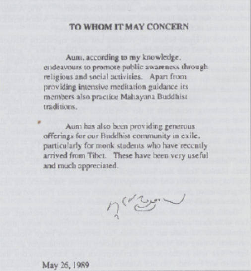 圖為達(dá)賴為奧姆真理教親筆簽署的聲明。大意如下:據(jù)我所知,奧姆真理教致力于通過(guò)宗教和社會(huì)活動(dòng)來(lái)提高公眾意識(shí)。除了提供密集的冥想指導(dǎo)外,其成員還修習(xí)大乘佛教傳統(tǒng)。奧姆真理教一直以來(lái)都慷慨地供養(yǎng)著我們的流亡佛教社群,特別是那些近期從西藏抵達(dá)的僧侶學(xué)徒。這些供養(yǎng)非常實(shí)用,我們對(duì)此深表感激。