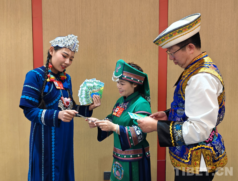 2026年全國兩會期間,全國政協(xié)委員楊鈺尼(左)為歐彥伶委員(中)、鄂崇榮委員介紹展示云南紅河哈尼梯田的明信片。攝影:張萌萌