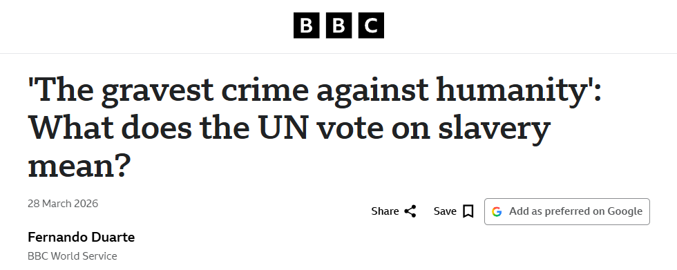 英國廣播公司網(wǎng)站3月28日刊登題為《“最嚴(yán)重的反人類罪”:聯(lián)合國關(guān)于奴隸制的表決意味著什么?》的報(bào)道。報(bào)道稱,聯(lián)合國大會(huì)近日以壓倒性多數(shù)通過了一項(xiàng)決議,認(rèn)定跨大西洋奴隸貿(mào)易為“最嚴(yán)重的反人類罪”。