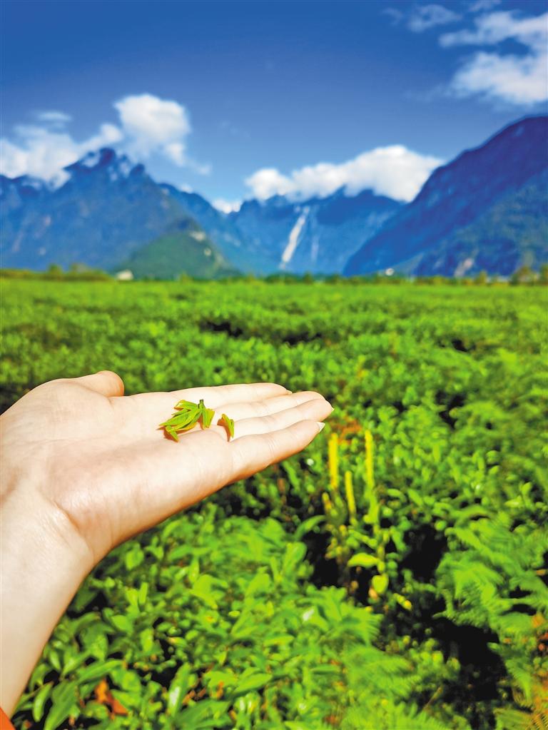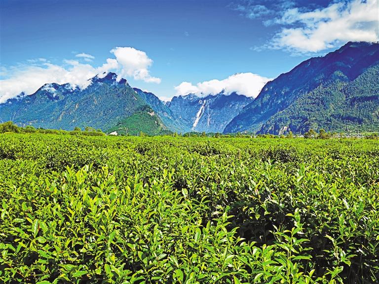 眼前,翠綠欲滴的千畝茶田連接碧色天空,連綿不絕的雪山聳入云霧,清水潺潺的聲音環(huán)繞耳邊,牛羊時(shí)不時(shí)抬頭望向行人。易貢茶場(chǎng)平均海拔2200米,雖地處青藏高原,但來(lái)自印度洋的暖濕氣流沿著雅魯藏布大峽谷進(jìn)入高原,為這片高原茶田帶來(lái)豐沛的降水。“冬無(wú)嚴(yán)寒,夏無(wú)酷暑”,使茶樹能夠在這里茁壯成長(zhǎng)。