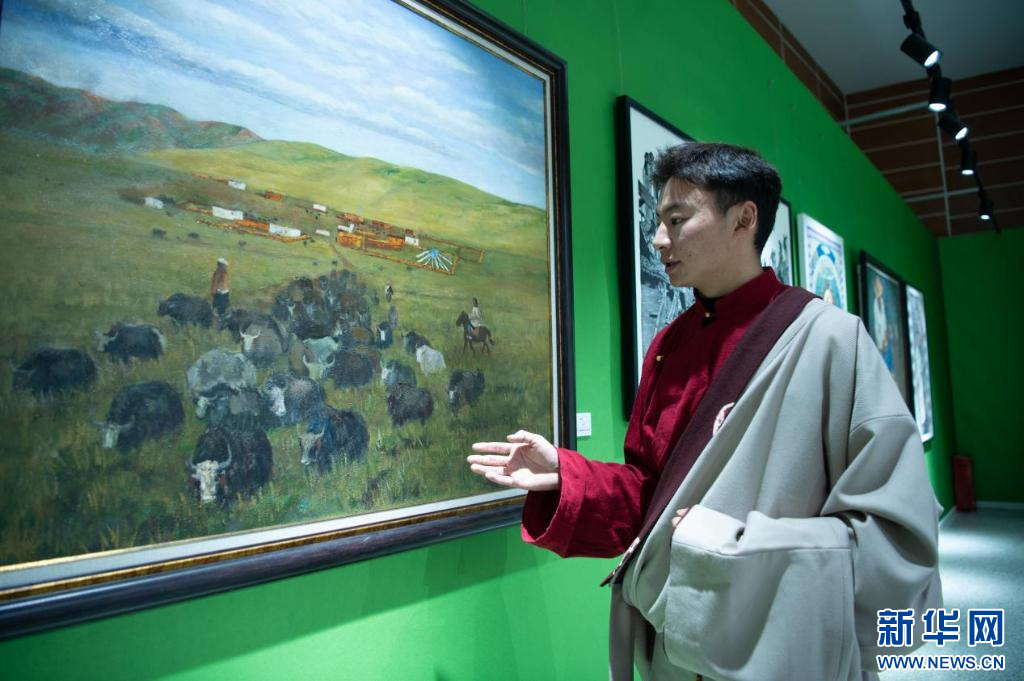4月28日,大賽美術(shù)組二等獎獲得者郭扎在介紹自己的作品。新華網(wǎng) 旦增努布 攝