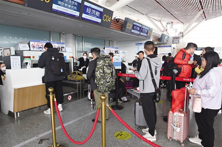 旅客在排隊辦理值機手續(xù)。資料圖