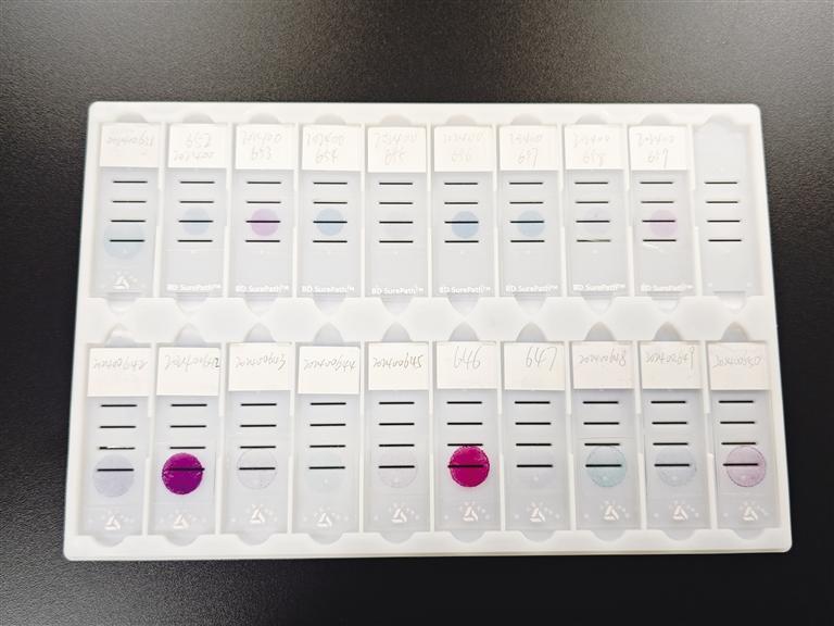 BD液基細(xì)胞制片儀所制的制片(上)與人工制片(下)對比圖。文/圖記者 黃帆 王鈞