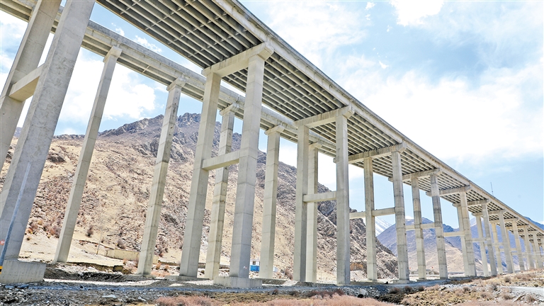 從村里看,一排整齊的高架橋墩像聳立的巨柱一樣,在山里蜿蜒。橋墩托舉著平坦寬闊的公路,從空中穿過,在海拔4200多米的半山腰一頭扎進(jìn)山體里,鑿出兩個(gè)山洞,然后貫穿圭嘎拉山,一直延伸到山南去。