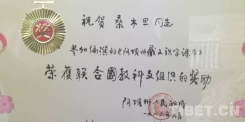 作為一個智慧過人的學(xué)者,1986年9月,為了藏語文教育的進一步普及,毛爾蓋·桑木旦不僅為掃盲四處奔跑,講授藏語文基礎(chǔ)課,而且主編了《藏文掃盲課本》,此書由國家教委推薦參加了亞太地區(qū)掃盲教材比賽,并榮獲聯(lián)合國教科文組織的獎勵。為此阿壩州人民政府頒發(fā)證書,祝賀桑木旦同志榮獲聯(lián)合國教科文組織的獎勵。我相信中國藏學(xué)界獲得此獎?wù)撸珷柹w·桑木旦先生為第一人。