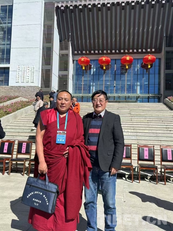 圖為作者格勒(右)在松潘縣第二屆毛爾蓋·桑木旦學(xué)術(shù)研討會現(xiàn)場(圖片由作者提供)