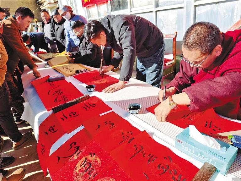 藏歷新年來臨之際,浪卡子縣浪卡子鎮(zhèn)農(nóng)牧民群眾齊聚一堂,舉行“蛇年新篇再起航 攜手并肩共奮斗”迎新年活動。活動現(xiàn)場,書法愛好者潑墨揮毫,根據(jù)群眾的需求,將對新年的美好祝愿融入一幅幅精美的春聯(lián)之中。