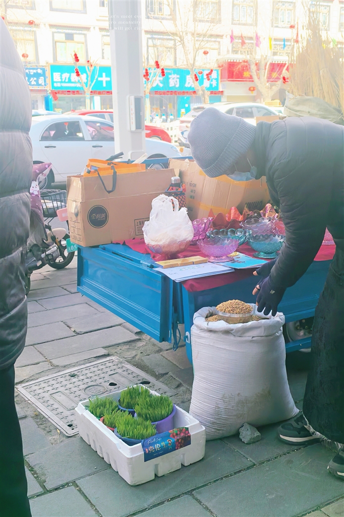 前來采購的格桑卓嘎阿姨,手里提著大包小包,臉上滿是笑意。她買了青稞酒、酥油、風干肉還有青稞苗。新年時,用青稞酒祈福,酥油茶招待客人,風干牛肉和新鮮軟糯的拉拉、用酥油雕出精美圖案的“推”一起擺盤,供客人隨時食用?!敖衲辍磐弧汀矢隆峭惶?,打算全家圍坐一起吃。家里布置都按習俗,擺好切瑪、德卡、青稞苗,再給門窗換上新的‘香布’。孩子們買了不少藏文對聯(lián),說是要貼門上,祈福來年順遂。帶孩子來傳統(tǒng)市集,就是要讓他們記住咱們藏歷新年的習俗。這些年,市集多了些漂亮的藏式手工藝品,不過最有年味兒的,還得是這糌粑和青稞粒的香?!?/p>
