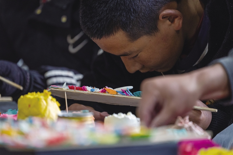 次仁羅布跟隨師傅已經(jīng)制作了30余年的酥油花。他告訴記者,在他的家鄉(xiāng)仁布縣,酥油花制作技藝是男女老少?gòu)男【驼莆盏募寄?,代代相傳。次仁羅布的大兒子今年上大一,自幼跟父親學(xué)習(xí)捏酥油花,手藝嫻熟,早些年開(kāi)始他就已經(jīng)可以和父親一樣獨(dú)立完成一對(duì)酥油花的制作。