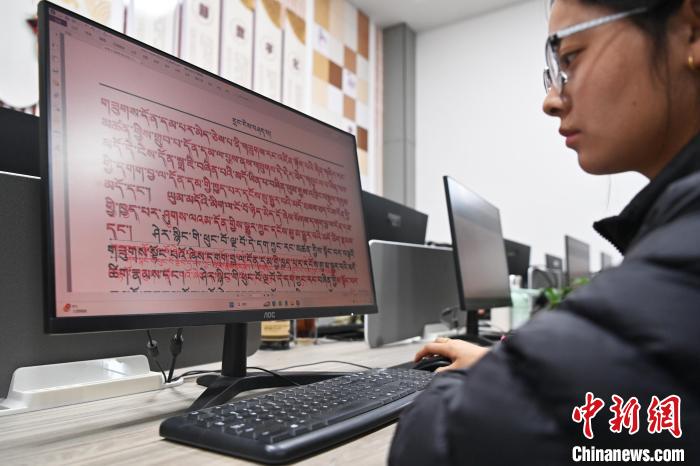 2月27日,在甘肅甘南藏族自治州碌曲縣益西達(dá)吉科技有限公司內(nèi),工作人員正在進(jìn)行藏文古籍?dāng)?shù)字化相關(guān)工作。該公司主要從事民族古籍?dāng)?shù)字化建設(shè)和古籍文獻(xiàn)數(shù)據(jù)庫(kù)建設(shè),自2019年以來(lái),承擔(dān)西藏、四川、甘肅等省區(qū)的藏文古籍?dāng)?shù)字化項(xiàng)目。圖為工作人員對(duì)藏文古籍?dāng)?shù)字化內(nèi)容進(jìn)行校對(duì)。中新社記者 九美旦增 攝