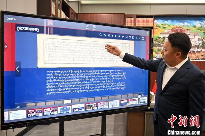 2月27日,在甘肅甘南藏族自治州碌曲縣益西達(dá)吉科技有限公司內(nèi),工作人員正在進(jìn)行藏文古籍?dāng)?shù)字化相關(guān)工作。該公司主要從事民族古籍?dāng)?shù)字化建設(shè)和古籍文獻(xiàn)數(shù)據(jù)庫(kù)建設(shè),自2019年以來(lái),承擔(dān)西藏、四川、甘肅等省區(qū)的藏文古籍?dāng)?shù)字化項(xiàng)目。圖為工作人員介紹藏文古籍?dāng)?shù)字化相關(guān)工作。中新社記者 九美旦增 攝