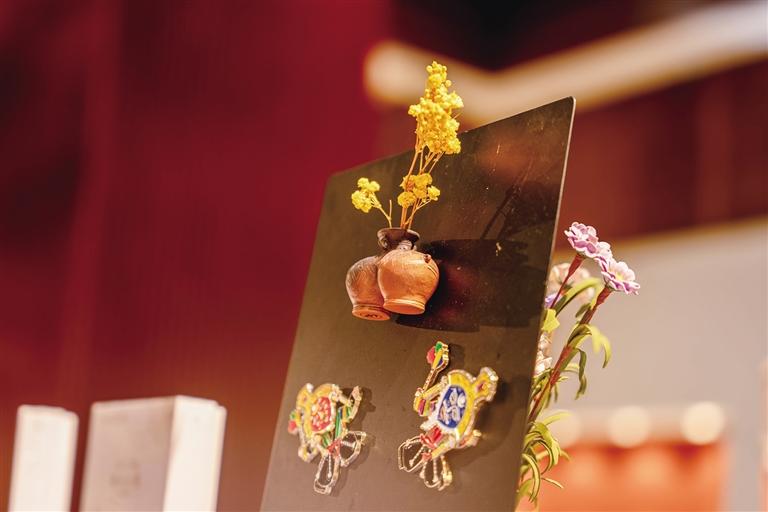 踏入文創(chuàng)展示區(qū),猶如穿越歷史長廊。《文成公主迎親圖》刺繡系列重現(xiàn)漢藏和親盛景,華美紋飾在紗幔上靈動舒展;鎮(zhèn)館之寶朱墨彩繪雙體陶罐化身實用藝術(shù)品,原始陶紋與插花功能巧妙結(jié)合,成為游客競相收藏的“微型博物館”。