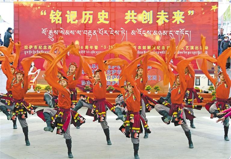 3月28日,拉薩市文旅局在宗角祿康公園舉辦了“銘記歷史 共創(chuàng)未來(lái)”拉薩市紀(jì)念西藏民主改革66周年暨 “3·28”西藏百萬(wàn)農(nóng)奴解放紀(jì)念日群眾文藝演出。圖為演出現(xiàn)場(chǎng)的舞蹈表演。記者 洛桑 攝