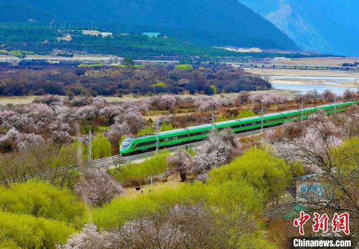 圖為飛馳在拉林鐵路桃花密林間的復(fù)興號(hào)列車。馬生明 攝